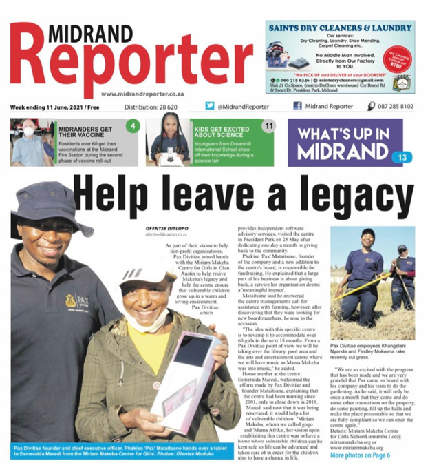 CEO and Founder of Pax Divitiae Phakiso Mataitsane serves on the board of trustees responsible for the centre where the main priority is to re-open the school and make use of the expansive land in Midrand to ensure that the centre is able to grow, housing even more young girls and women on the grounds safely.